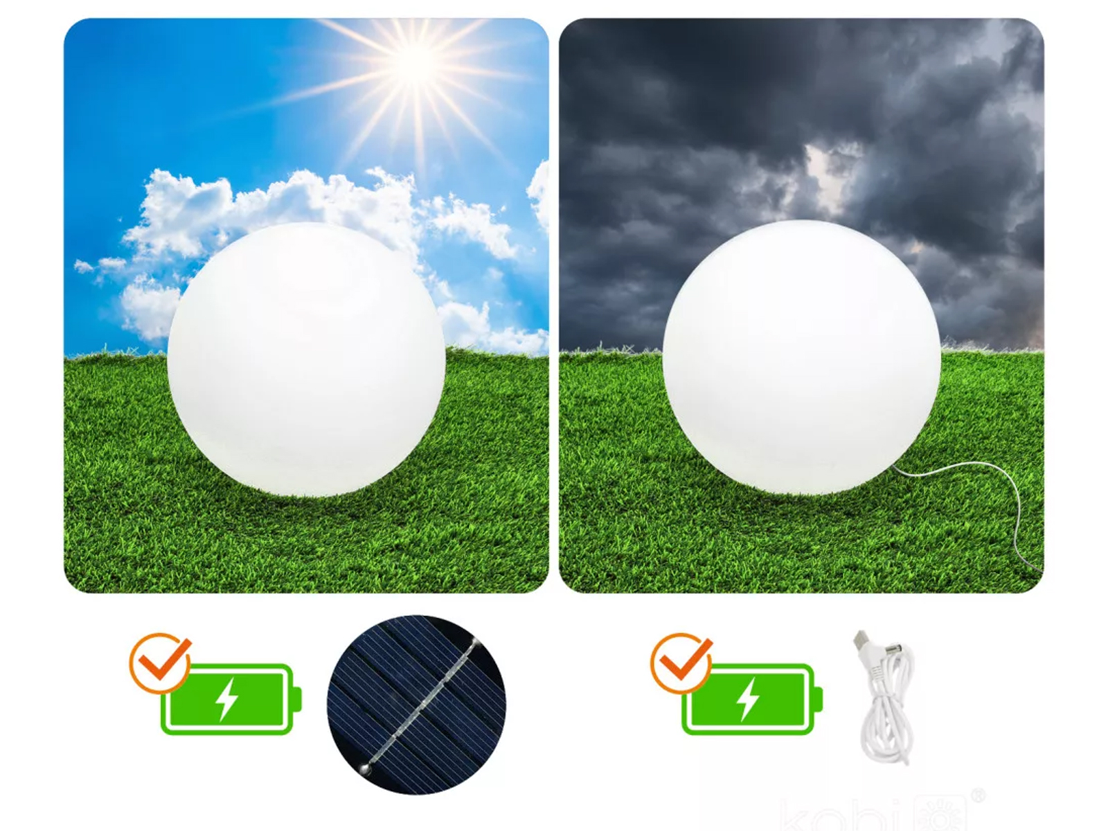A napelem a búra belsejében található, de a mellékelt kábel segítségével is tölthető. Az adapter nem része a csomagnak, azonban webáruházunkban megvásárolhatja.